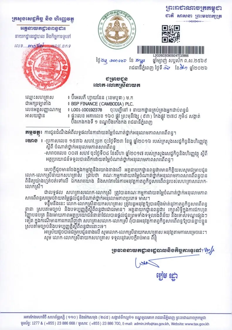 April 1, 2026 - Congratulations to Tonle Finance Plc. on receiving the Gold Tax Compliance Certificate from the General Department of Taxation (GDT), valid for the 2026–2027 tax period. It is worth noting that Tonle Finance Plc., a subsidiary of RMA Cambodia, was recently rebranded from BSP Finance with a new name and identity.