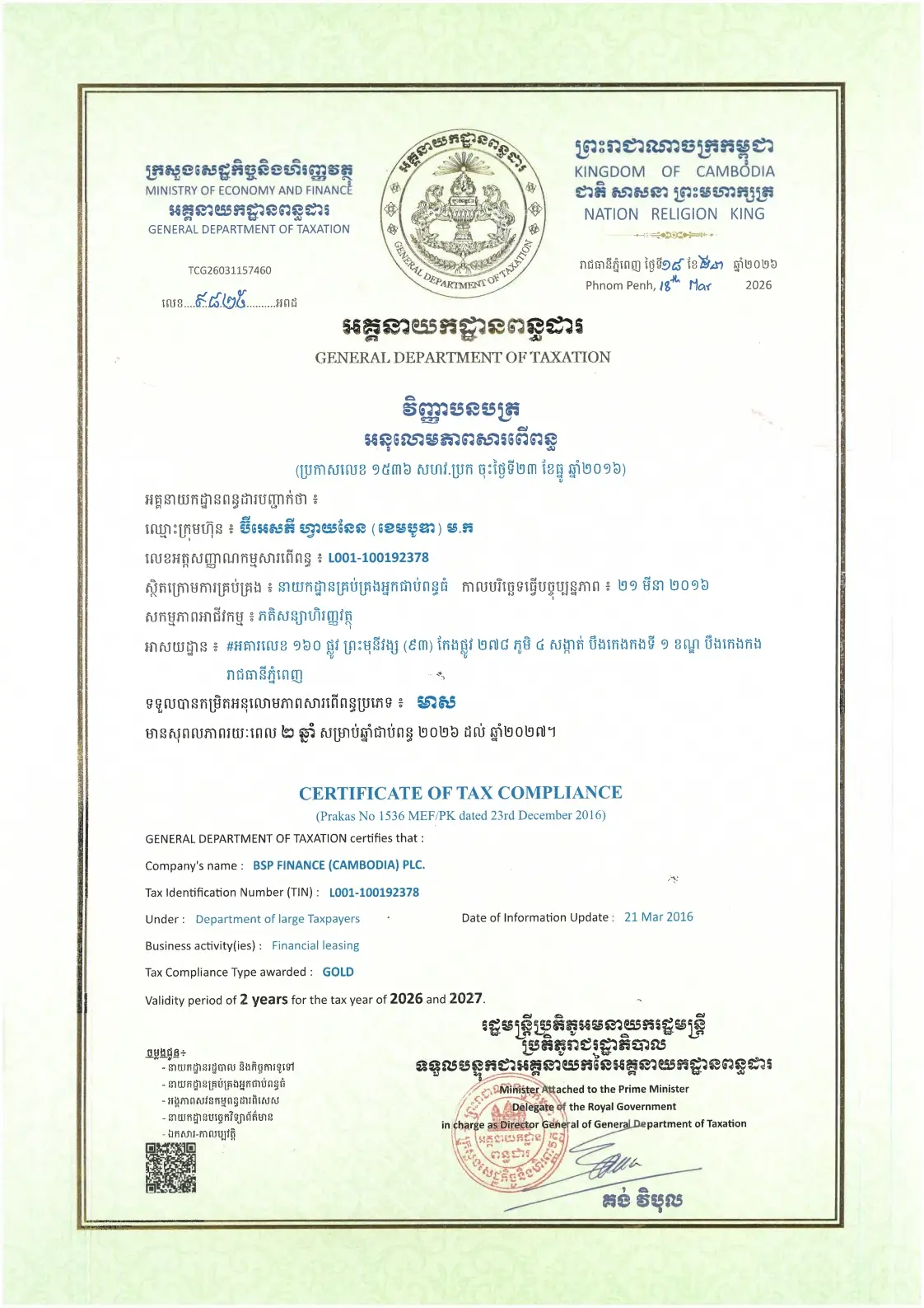 Tonle Finance Plc. Receives Gold Tax Compliance Certificate from the GDT